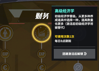 最后一个是高级经济学。从初级经济学晋级而来,从更多种养成道具中选择一种,道具数量也会更多(激活后初级经济学将被替代),每日可使用1次,每日8点刷新。