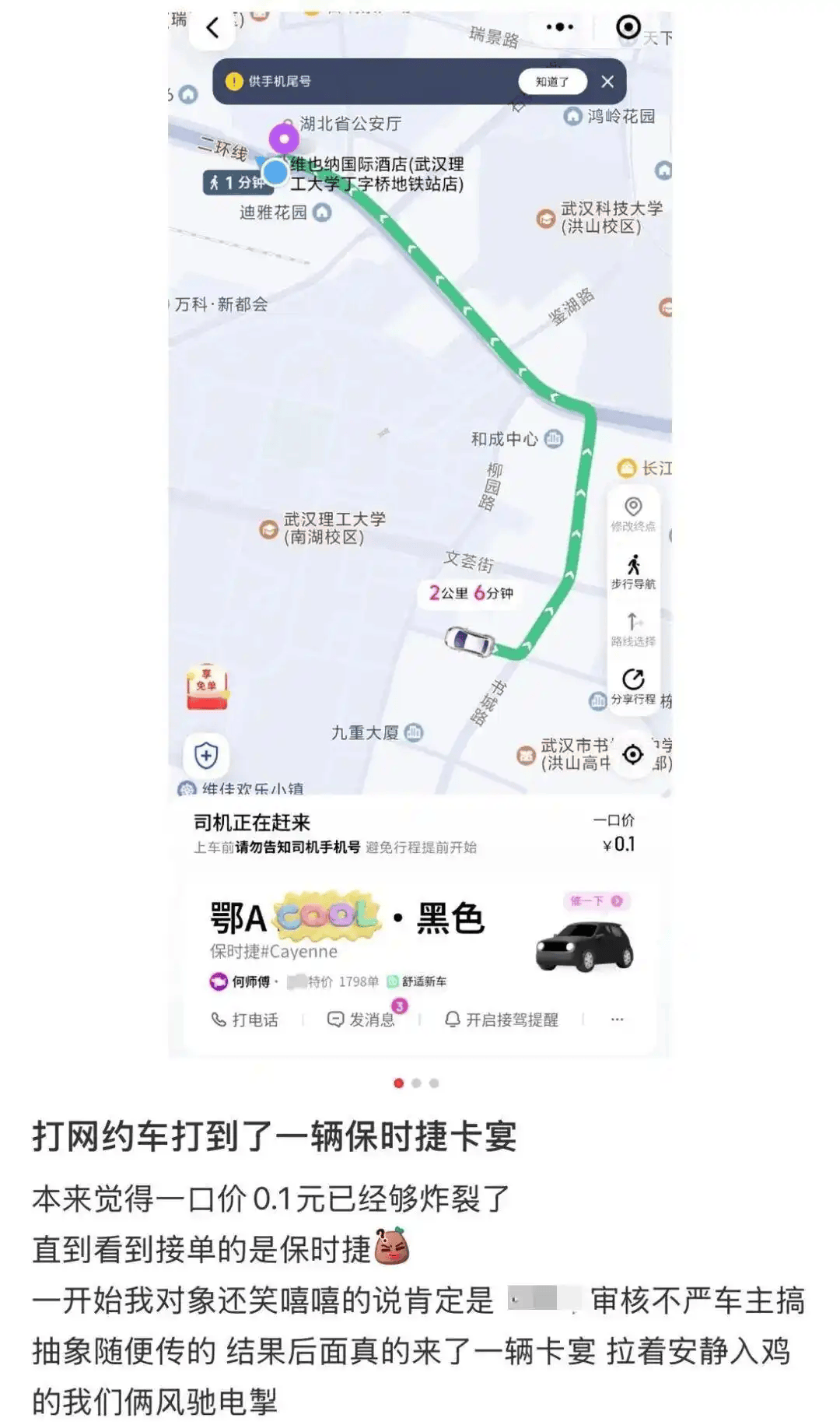 发帖人刘女士(化姓)向极目新闻记者讲述了经过。她趁元旦假期回武汉母校,1月4日晚打车前往火车站时,打到了一辆保时捷卡宴。等车期间还有个小插曲,因等待时间稍长,平台弹出提示询问“是否需要寻找更近的司机”。刘女士笑称,当时也就等了四五分钟,“我第一次如此坚定且迅速地点了‘不需要’”。对于0.1元的车费,刘女士解释,当晚行程原价不到8元,由于使用了平台的立减券,最终结算时只需支付0.1元。