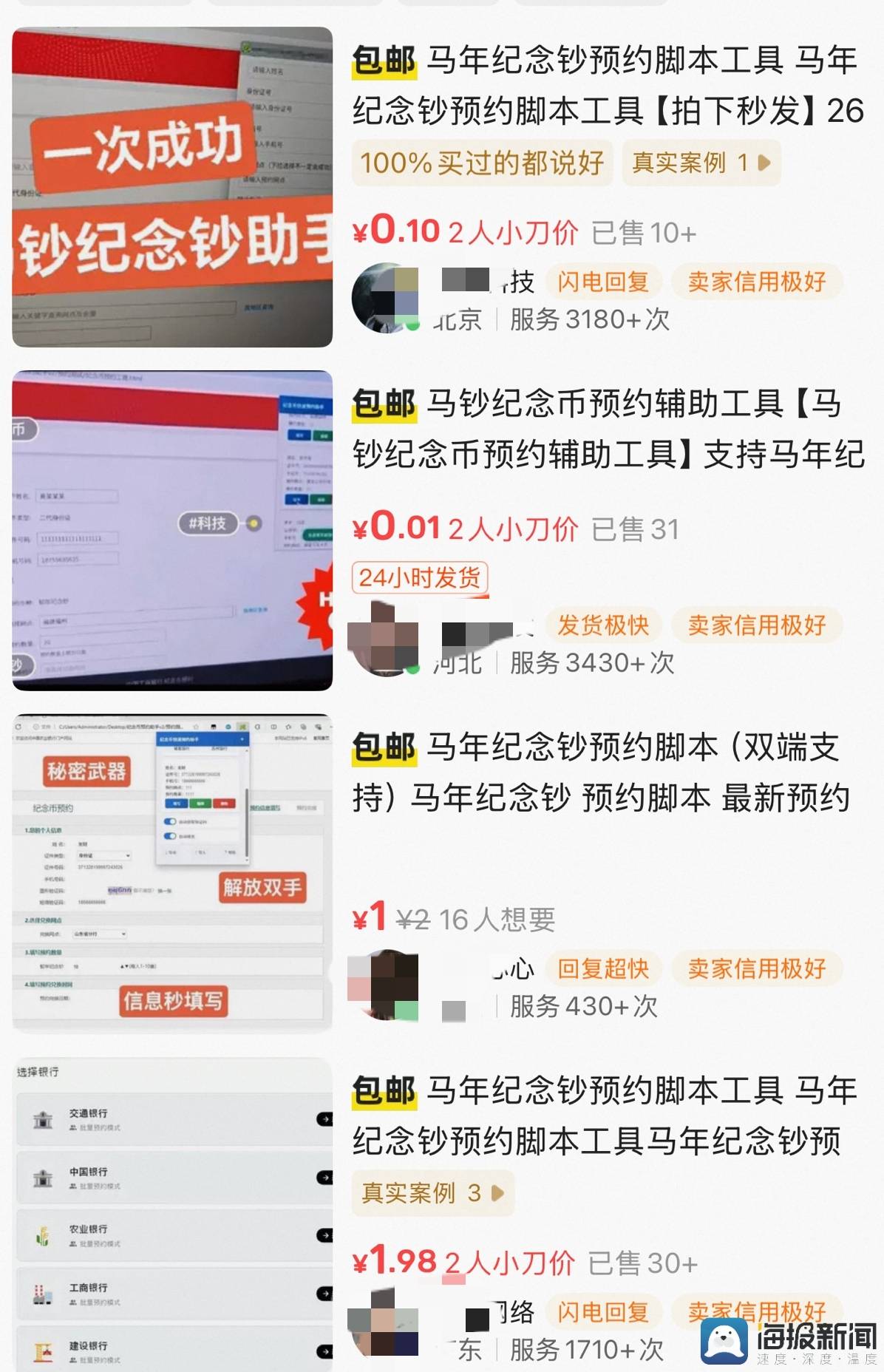 此外,黄牛产业链的介入加剧了供需失衡。二手平台甚至出现售价1-10元的“预约神器”,声称可“一键填充信息、极速预约”。1月16日,有售卖“预约脚本”的卖家告诉记者,“是最新科技,去年蛇钞我们就预约成功了20多套,所有银行都可以!”