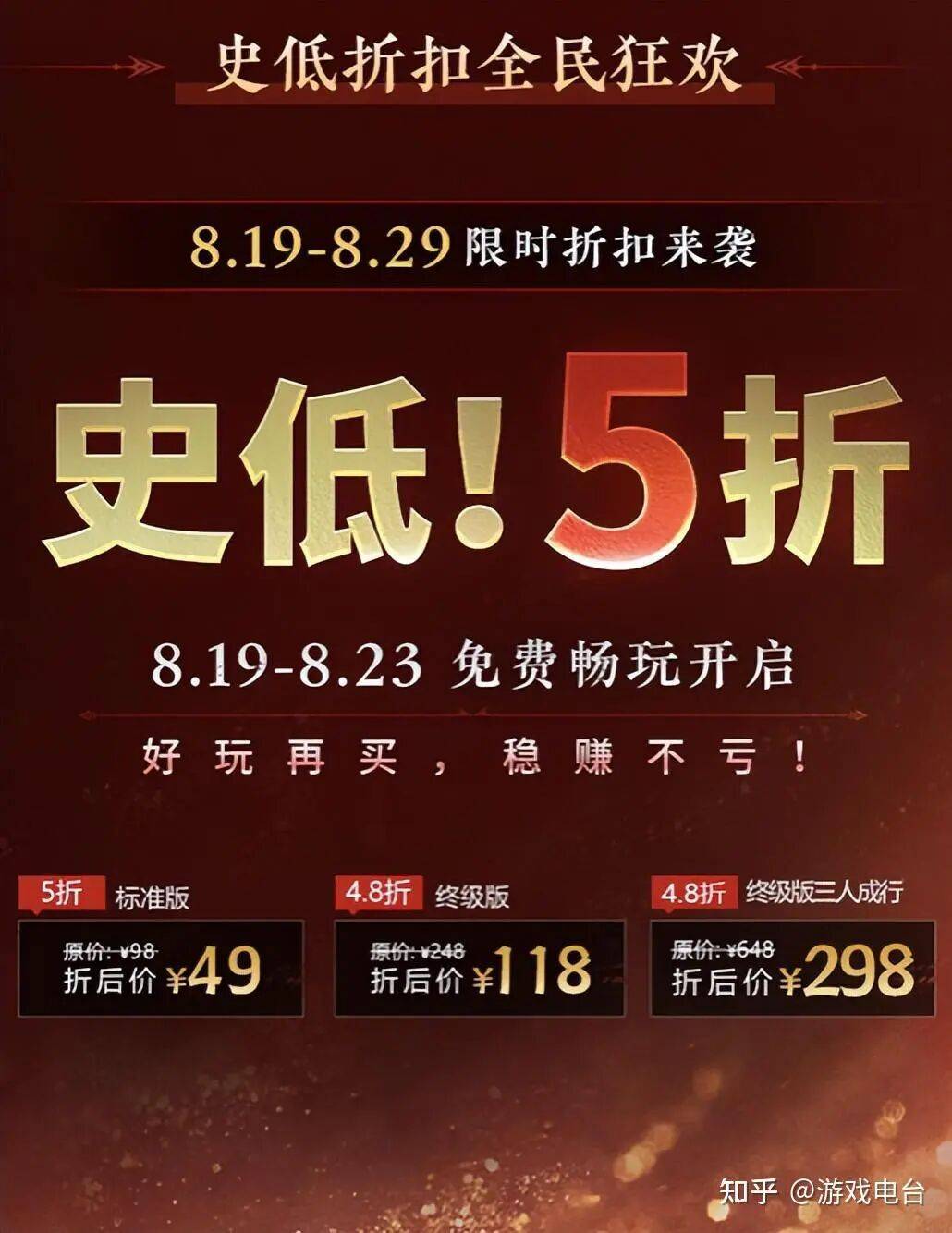 在这之前,游戏其实已经历经了几次“打骨折”,98 的原价在免费前夕一度能对半砍,当然如果还有些特殊渠道或者活动叠加的话,甚至可以用更低的价格入手。