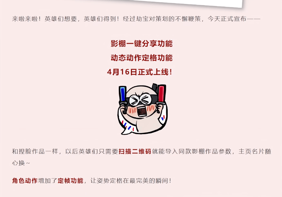 它推出了新的 3v3 竞赛模式,响应了玩家观察时装的需求,追加了影棚的新功能,原本是氪金点的捏脸也开始放开随便换了。
