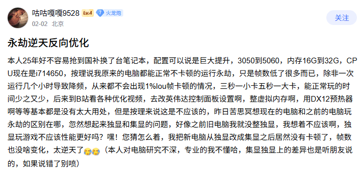 一直以来对配置要求过高的核心问题,就暴露出来了。所谓的配置要求并不局限于最直观的“硬件配置”,虽然这部分也是玩家目前为止诟病最多的,但永劫无间是非常少见的