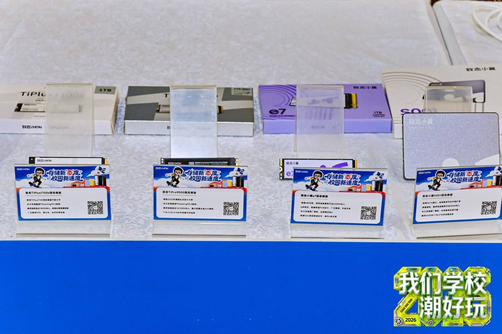 致态展台的产品区展示了全系的存储产品,涵盖大学校园的所有使用场景。例如固态硬盘中,PCIe5.0旗舰TiPro9000专注游戏电竞和专业创作,超级“全能战士”TiPlus7100s是装机升级的主力。除此之外,致态还面向年轻群体推出了全新的品牌——致态小翼,旗下的两款e7和S001两款新品也同步展出,无论是台式机/笔记本扩容还是给老电脑升级,都能找到合适的产品。