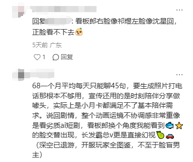游戏内的基础月卡68元起步,每天免费聊天额度仅10轮,基本只够做日活,如果想要陪伴感就得花大价钱买条数。加上男主长相人山人海、主线剧情薄弱、角色性格崩坏、回复经常爹味十足等问题,这款融资3000万美元的产品目前在苹果商店的评分仅2.8星(满分5星)。