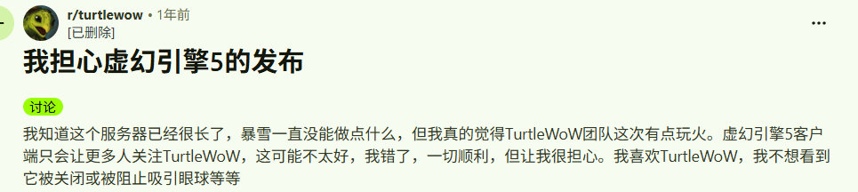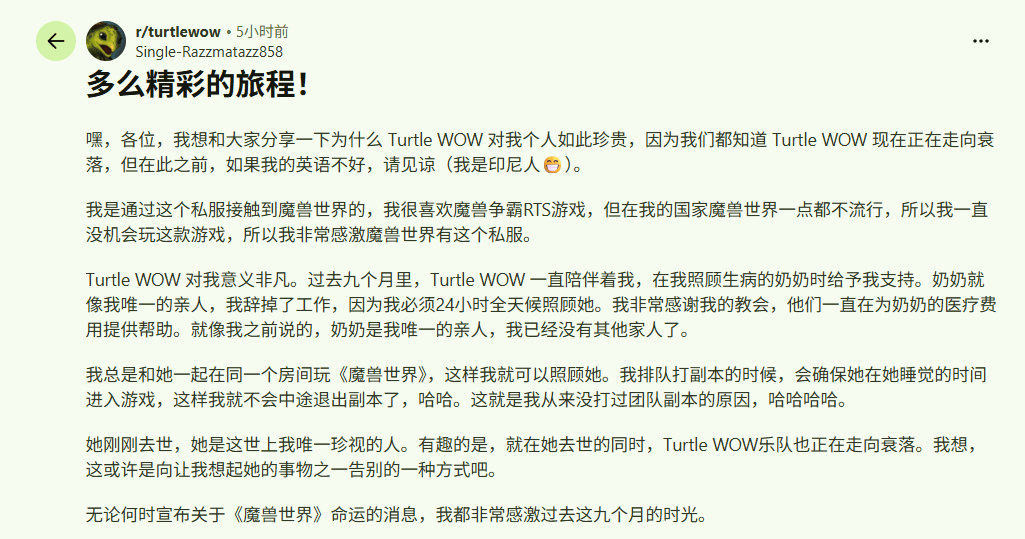 在Reddit上,不少玩家都在感激乌龟服带给他们的游戏时光。甚至有人表示,想要在服务器关闭的那一天,集聚一批60级“硬核模式(死亡无法复活)”角色在古拉巴什竞技场来上一场血腥斗技,为这个服务器献上最后的致意。