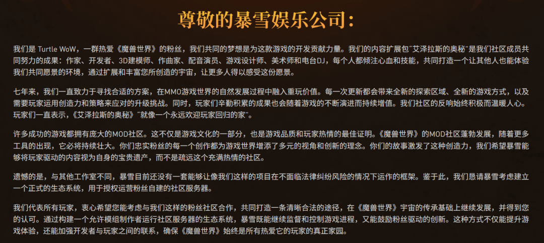 他们也罗列了那些成功的合作案例:比如与FiveM平台合作,支持独立社区运营的R星、微软允许Hypixel、Mineplex等第三方服务器托管《我的世界》多人游戏、《无尽的任务》授权Project 1999私服运行,诸如此类。或许......暴雪官方再宽容一点,乌龟服再低调一点,这起事件就会迎来截然相反的结局?