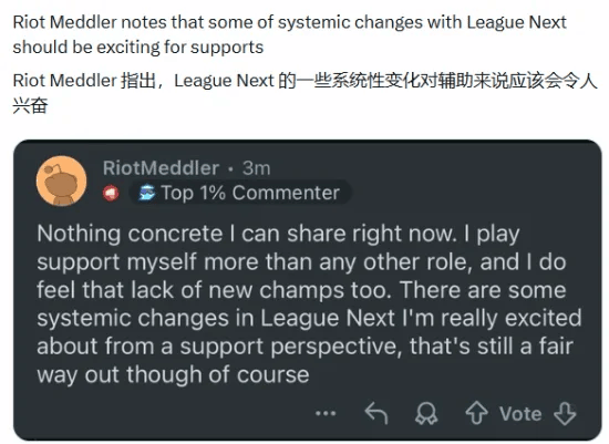 拳头高级副总裁Andrei “Meddler” van Roon透露,辅助位的重大调整也将在“League Next”更新中落地。他表示:“在‘League Next’中,有一些从辅助视角来看我非常期待的系统性改动,当然那还需要一段时间。”