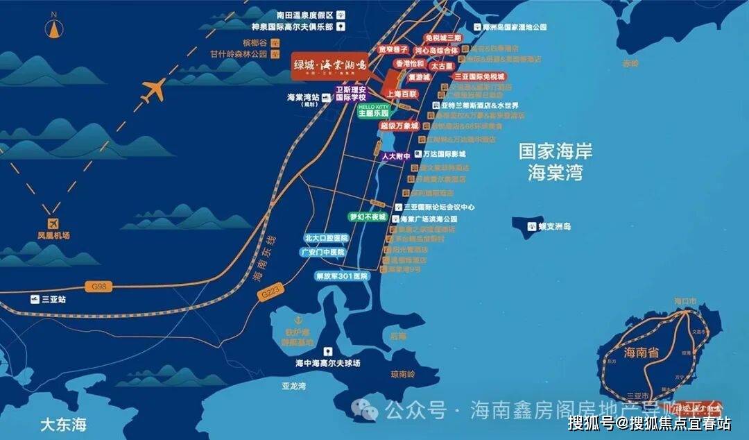 ·国家海岸海棠湾、蜈支洲岛旅游资源、万亩国家湿地公园、椰子洲岛、海中海高尔夫、老虎高尔夫学院;